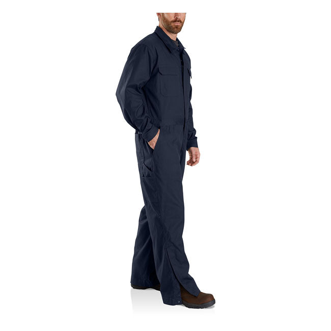 The Carhartt Canvas coverall allows for more movement with it''s loose and straight fit. Made of stretch cotton blend with elastane. Features multiple utility pockets; two-way front zipper with interior storm flap and ankle-to-knee leg opening with snap closure fits over workboots and snap adjustable cuffs.