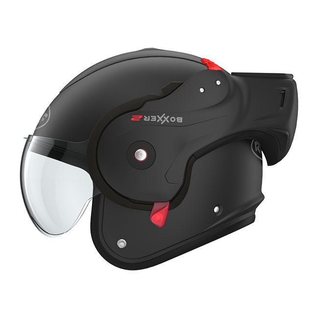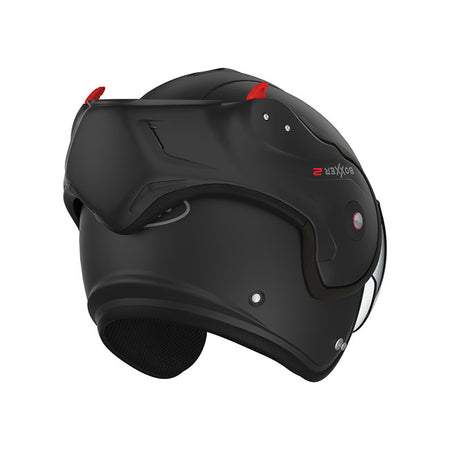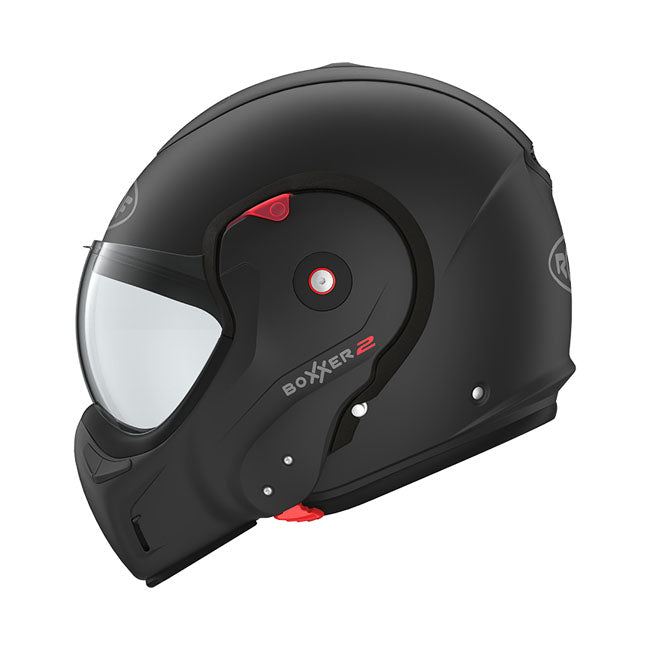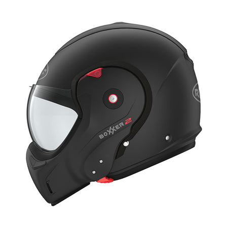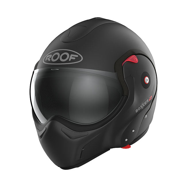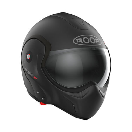 From BOXER to BOXXER; the 180ø versatile ROOF helmet has benefited from many innovations over the years while maintaining its assertive and remarkable character. The design of the ROOF BOXXER 2 evolves towards tighter lines while retaining the iconic look of the ROOF BOXXER. The helmet offers a premium finish with a premium fiberglass shell and lightweight comfort fabric combined with cutting-edge technologies: reversible lip seal; high-end comfort and Silent Lining; active and passive defogging. The automatic locking of the chin bar and the one-handed sequential unlocking ensures fast and simple gesture while maintaining control of your two-wheeler. An exclusive system patented by ROOF to meet the new E22-06 standard; the FleXLocker ROOF allows to lock; if needed; the chin bar in open position and integrates perfectly and aesthetically into the versatility of the helmet in open or closed position. The chin bar is held infallibly in its position to ensure the control of shock where the protection is maximum.